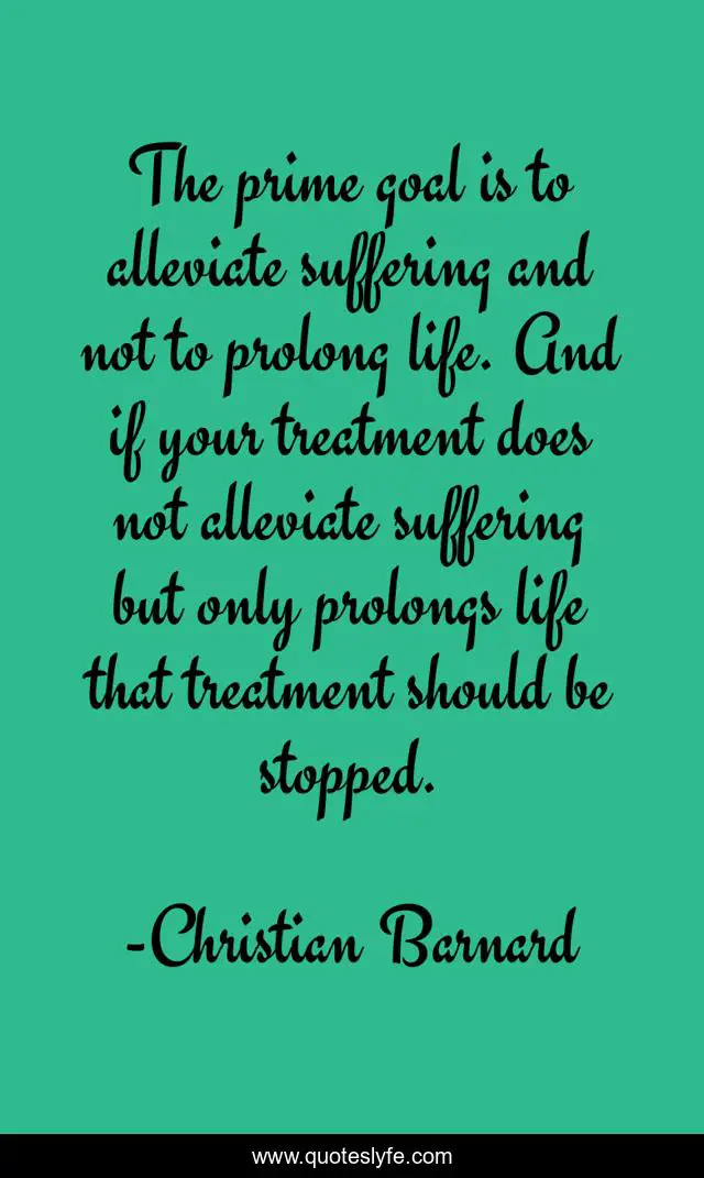 This page presents the quote "The prime goal is to alleviate suffering and not to prolong life. And if your treatment does not alleviate suffering but only prolongs life that treatment should be stopped.". Author of this quote is Christian Barnard. This quote is about medicine, sickness,.
