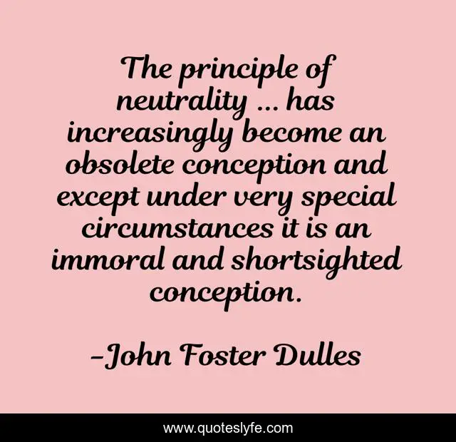 This page presents the quote "The principle of neutrality ... has increasingly become an obsolete conception and except under very special circumstances it is an immoral and shortsighted conception.". Author of this quote is John Foster Dulles. .