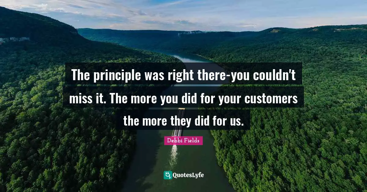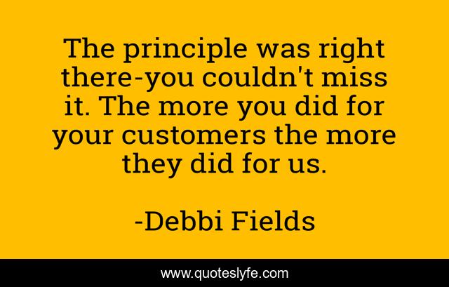 This page presents the quote "The principle was right there-you couldn't miss it. The more you did for your customers the more they did for us.". Author of this quote is Debbi Fields. This quote is about helping, people,.