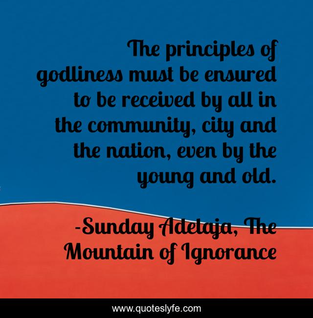 This page presents the quote "The principles of godliness must be ensured to be received by all in the community, city and the nation, even by the young and old.". Author of this quote is Sunday Adelaja, The Mountain of Ignorance. This quote is about city, life, darkness, power, danger, god, people, principles, community,.