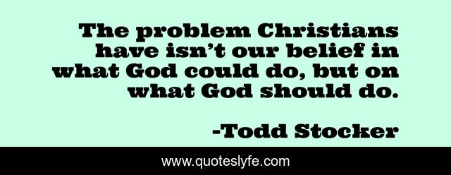 This page presents the quote "The problem Christians have isn’t our belief in what God could do, but on what God should do.". Author of this quote is Todd Stocker. This quote is about confidence, christian, god, motivational, christianity, christian-living, positive, optimistic,.