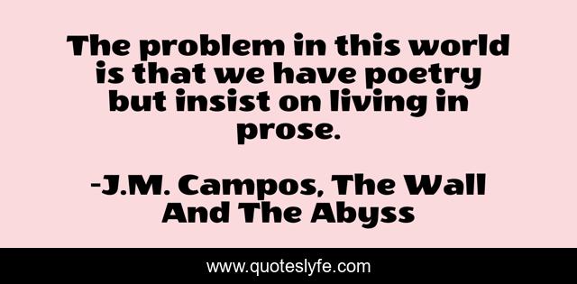 This page presents the quote "The problem in this world is that we have poetry but insist on living in prose.". Author of this quote is J.M. Campos, The Wall And The Abyss. This quote is about beauty, human-nature, human-spirit, poetry, mankind, prose, world,.