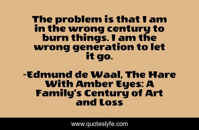 This page presents the quote "The problem is that I am in the wrong century to burn things. I am the wrong generation to let it go.". Author of this quote is Edmund de Waal, The Hare With Amber Eyes: A Family's Century of Art and Loss. This quote is about letting-go, burning,.