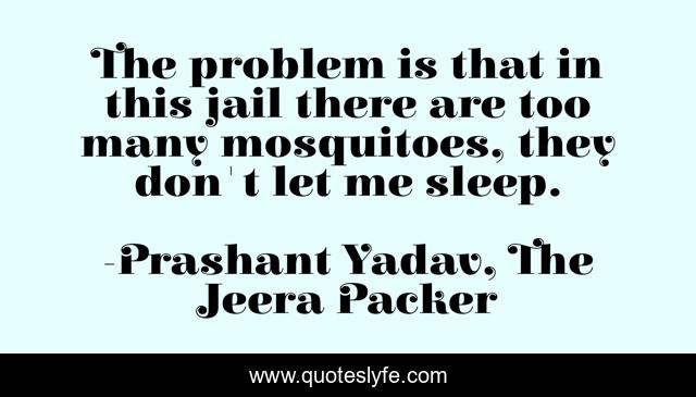 This page presents the quote "The problem is that in this jail there are too many mosquitoes, they don't let me sleep.". Author of this quote is Prashant Yadav, The Jeera Packer. This quote is about sarcasm, sarcastic, sarcastic-observations,.