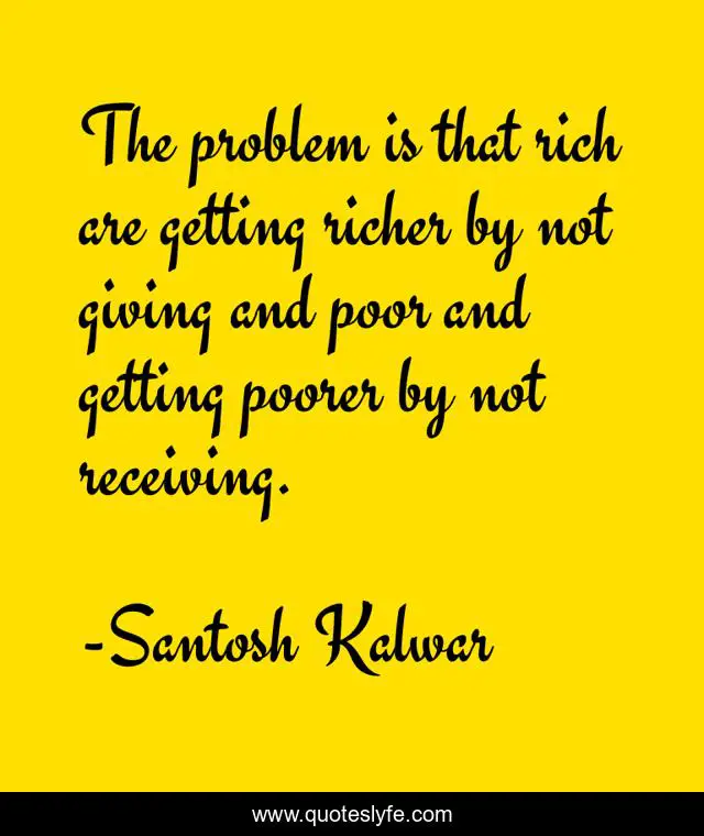 This page presents the quote "The problem is that rich are getting richer by not giving and poor and getting poorer by not receiving.". Author of this quote is Santosh Kalwar. This quote is about poor, funding, giving, discrimination, society, inequality, rich, problem, receiving,.
