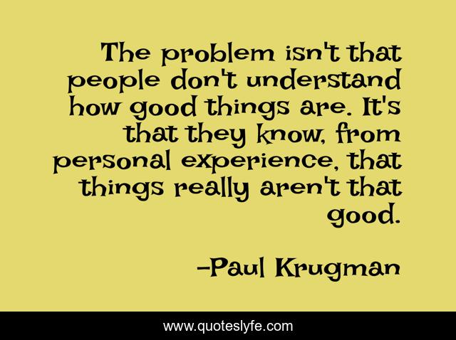 This page presents the quote "The problem isn't that people don't understand how good things are. It's that they know, from personal experience, that things really aren't that good.". Author of this quote is Paul Krugman. This quote is about problem, good, people,.