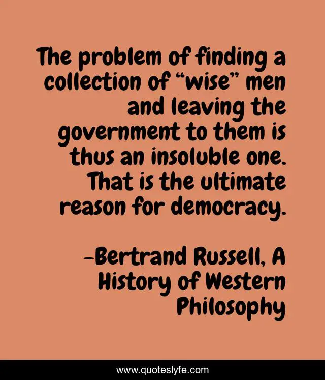 This page presents the quote "The problem of finding a collection of “wise” men and leaving the government to them is thus an insoluble one. That is the ultimate reason for democracy.". Author of this quote is Bertrand Russell, A History of Western Philosophy. .
