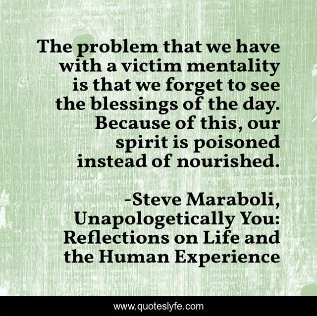 This page presents the quote "The problem that we have with a victim mentality is that we forget to see the blessings of the day. Because of this, our spirit is poisoned instead of nourished.". Author of this quote is Steve Maraboli, Unapologetically You: Reflections on Life and the Human Experience. This quote is about gratitude, appreciation, victim-mentality, blessings, spiritual-growth,.