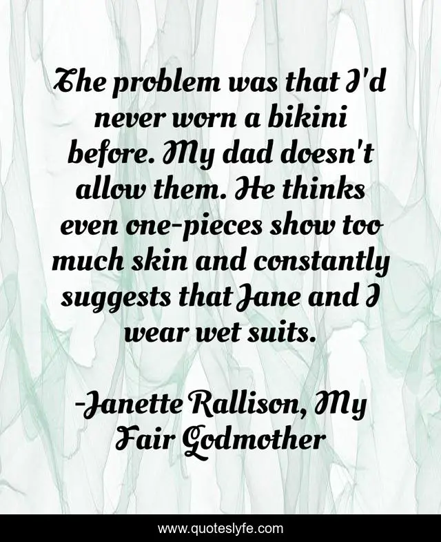 This page presents the quote "The problem was that I'd never worn a bikini before. My dad doesn't allow them. He thinks even one-pieces show too much skin and constantly suggests that Jane and I wear wet suits.". Author of this quote is Janette Rallison, My Fair Godmother. This quote is about bikinis, rules, parents, bathing-suits,.