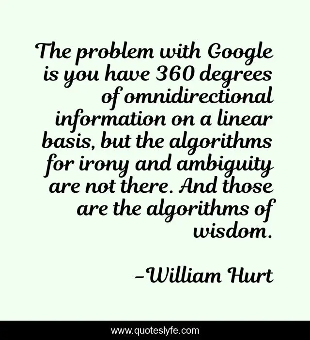 This page presents the quote "The problem with Google is you have 360 degrees of omnidirectional information on a linear basis, but the algorithms for irony and ambiguity are not there. And those are the algorithms of wisdom.". Author of this quote is William Hurt. This quote is about information, problem, irony,.