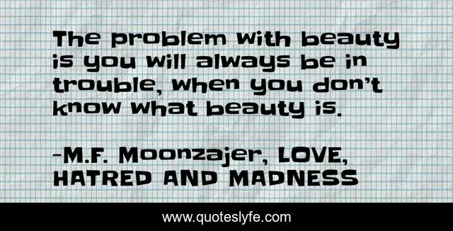 "M.F. Moonzajer, LOVE, HATRED AND MADNESS Quotes." Quoteslyfe.com, 2025. Sun. 07 Dec. 2025. <https://www.quoteslyfe.com/quote/The-problem-with-beauty-is-you-will-253133>.