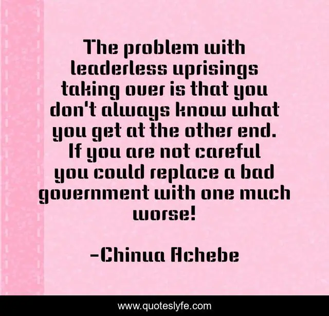 "Chinua Achebe Quotes." Quoteslyfe.com, 2025. Fri. 05 Dec. 2025. <https://www.quoteslyfe.com/quote/The-problem-with-leaderless-uprisings-taking-over-320922>.