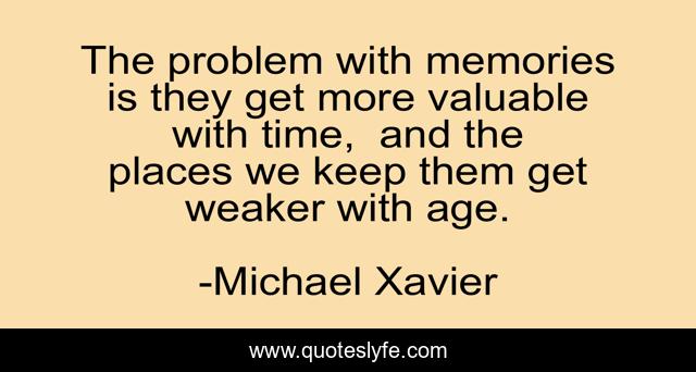 This page presents the quote "The problem with memories is they get more valuable with time, and the places we keep them get weaker with age.". Author of this quote is Michael Xavier. This quote is about memories, ageing, age, memory,.