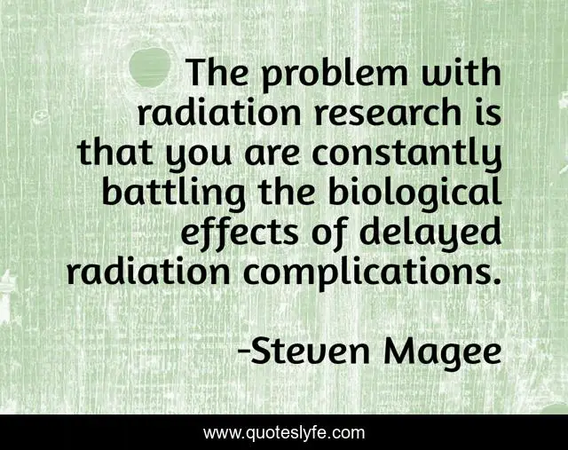 This page presents the quote "The problem with radiation research is that you are constantly battling the biological effects of delayed radiation complications.". Author of this quote is Steven Magee. This quote is about battling, constantly, radiation, delayed, research, complications, effects, biological, problem,.