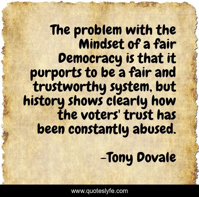 This page presents the quote "The problem with the Mindset of a fair Democracy is that it purports to be a fair and trustworthy system, but history shows clearly how the voters' trust has been constantly abused.". Author of this quote is Tony Dovale. This quote is about success, success-self-improvement, attitude, behaviour, tony-dovale, success-strategies, rethink-your-mindset, mindset,.