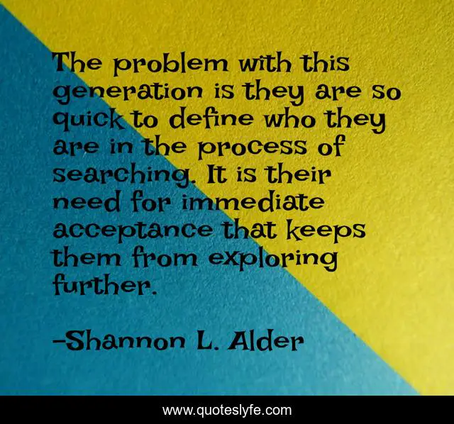 This page presents the quote "The problem with this generation is they are so quick to define who they are in the process of searching. It is their need for immediate acceptance that keeps them from exploring further.". Author of this quote is Shannon L. Alder. This quote is about religion, confidence, conformity, purpose,.