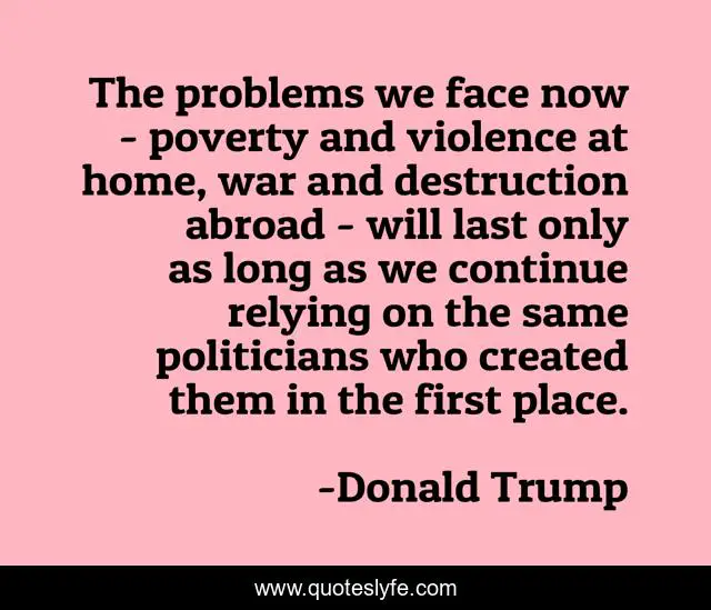 This page presents the quote "The problems we face now - poverty and violence at home, war and destruction abroad - will last only as long as we continue relying on the same politicians who created them in the first place.". Author of this quote is Donald Trump. This quote is about home, violence, poverty,.