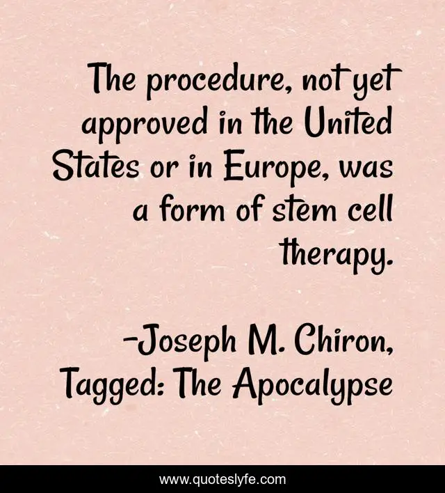 This page presents the quote "The procedure, not yet approved in the United States or in Europe, was a form of stem cell therapy.". Author of this quote is Joseph M. Chiron, Tagged: The Apocalypse. This quote is about zombie-horror, zombies, zombie-apocalypse,.