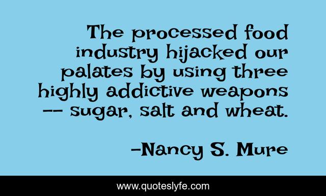This page presents the quote "The processed food industry hijacked our palates by using three highly addictive weapons -- sugar, salt and wheat.". Author of this quote is Nancy S. Mure. This quote is about fitness-inspiration, junk, gmo, food, sugar, alternative-health, weight-loss, holistic-health, wheat,.