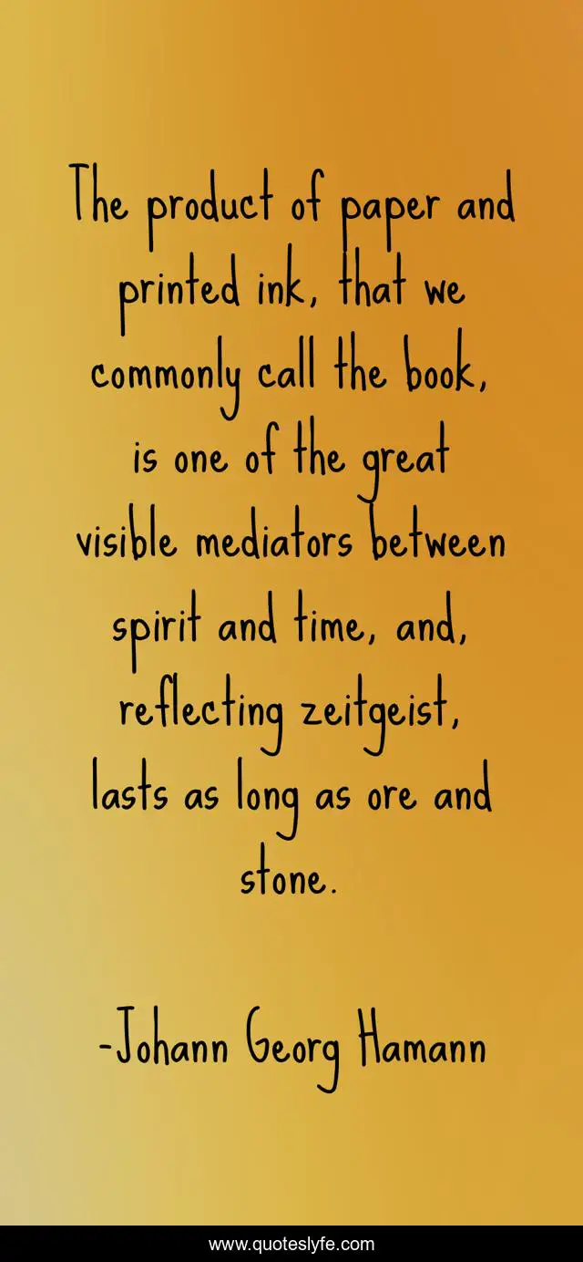This page presents the quote "The product of paper and printed ink, that we commonly call the book, is one of the great visible mediators between spirit and time, and, reflecting zeitgeist, lasts as long as ore and stone.". Author of this quote is Johann Georg Hamann. .