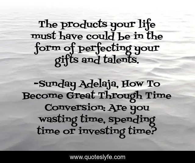 This page presents the quote "The products your life must have could be in the form of perfecting your gifts and talents.". Author of this quote is Sunday Adelaja, How To Become Great Through Time Conversion: Are you wasting time, spending time or investing time?. This quote is about life, conversion, productivity, wealth, talents-and-gifts, greatness, waste, humanity, product,.