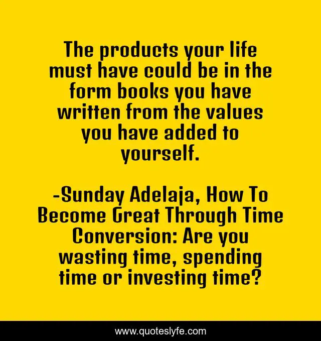 This page presents the quote "The products your life must have could be in the form books you have written from the values you have added to yourself.". Author of this quote is Sunday Adelaja, How To Become Great Through Time Conversion: Are you wasting time, spending time or investing time?. This quote is about life, books, self-worth, conversion, productivity, wealth, self-value, greatness, values,.