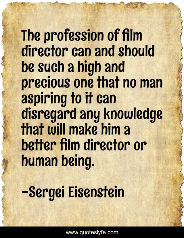 This page presents the quote "The profession of film director can and should be such a high and precious one that no man aspiring to it can disregard any knowledge that will make him a better film director or human being.". Author of this quote is Sergei Eisenstein. This quote is about better, human, man,.