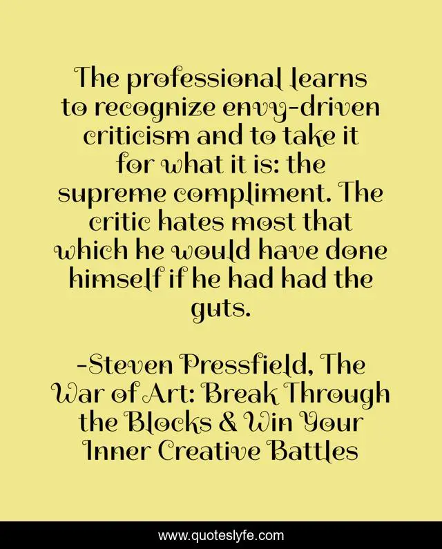 This page presents the quote "The professional learns to recognize envy-driven criticism and to take it for what it is: the supreme compliment. The critic hates most that which he would have done himself if he had had the guts.". Author of this quote is Steven Pressfield, The War of Art: Break Through the Blocks & Win Your Inner Creative Battles. This quote is about art, envy, creativity, writing,.