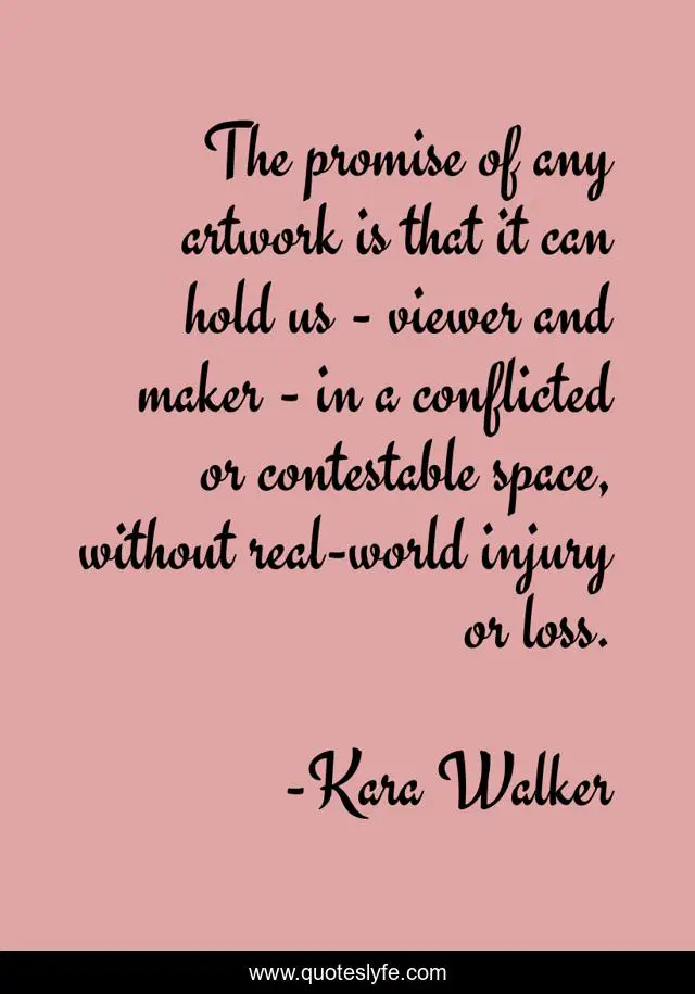 This page presents the quote "The promise of any artwork is that it can hold us - viewer and maker - in a conflicted or contestable space, without real-world injury or loss.". Author of this quote is Kara Walker. This quote is about loss, hold, without,.
