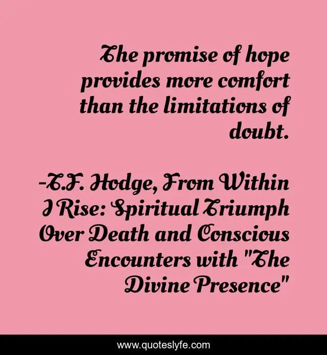 This page presents the quote "The promise of hope provides more comfort than the limitations of doubt.". Author of this quote is T.F. Hodge, From Within I Rise: Spiritual Triumph Over Death and Conscious Encounters with "The Divine Presence". This quote is about limitations, faith, anxiety, faithfulness, limits, comfort, doubt, promise, fear,.