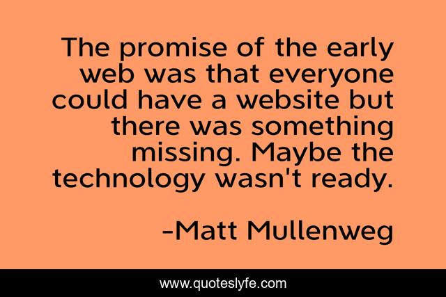 This page presents the quote "The promise of the early web was that everyone could have a website but there was something missing. Maybe the technology wasn't ready.". Author of this quote is Matt Mullenweg. This quote is about early, website, missing,.