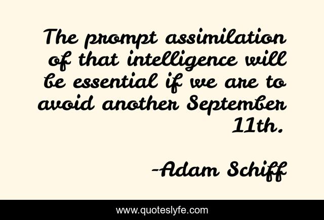 This page presents the quote "The prompt assimilation of that intelligence will be essential if we are to avoid another September 11th.". Author of this quote is Adam Schiff. This quote is about september, avoid,.