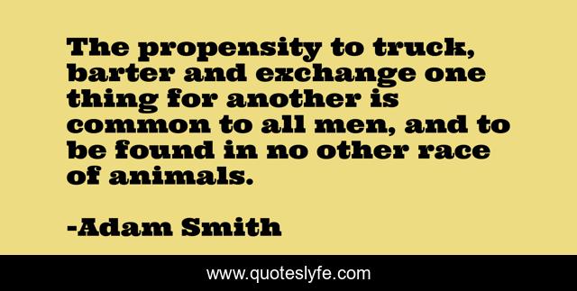 This page presents the quote "The propensity to truck, barter and exchange one thing for another is common to all men, and to be found in no other race of animals.". Author of this quote is Adam Smith. This quote is about animals, men, truck,.