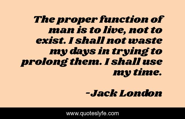 This page presents the quote "The proper function of man is to live, not to exist. I shall not waste my days in trying to prolong them. I shall use my time.". Author of this quote is Jack London. This quote is about function, living, days, mankind, existence, wasting-time,.