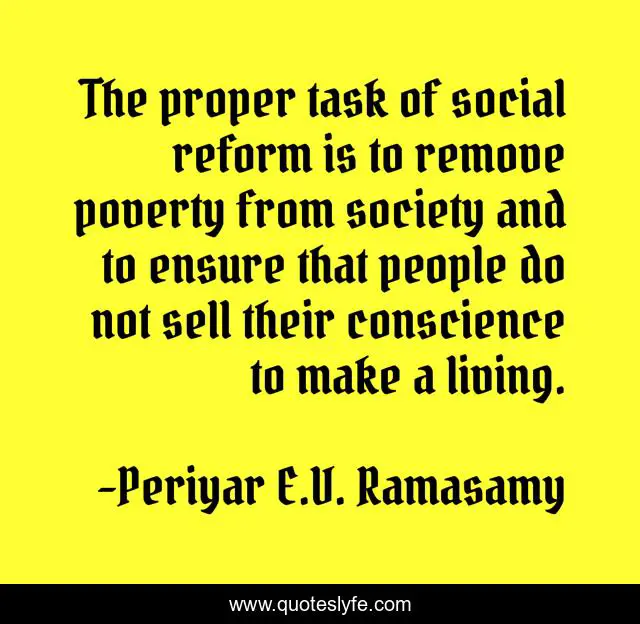 This page presents the quote "The proper task of social reform is to remove poverty from society and to ensure that people do not sell their conscience to make a living.". Author of this quote is Periyar E.V. Ramasamy. This quote is about conscience, society, poverty, reform,.