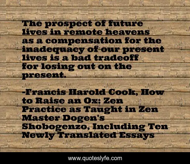 This page presents the quote "The prospect of future lives in remote heavens as a compensation for the inadequacy of our present lives is a bad tradeoff for losing out on the present.". Author of this quote is Francis Harold Cook, How to Raise an Ox: Zen Practice as Taught in Zen Master Dogen's Shobogenzo, Including Ten Newly Translated Essays. This quote is about live-in-the-here-and-now, present-moment, buddhism, zen, live-in-the-moment,.