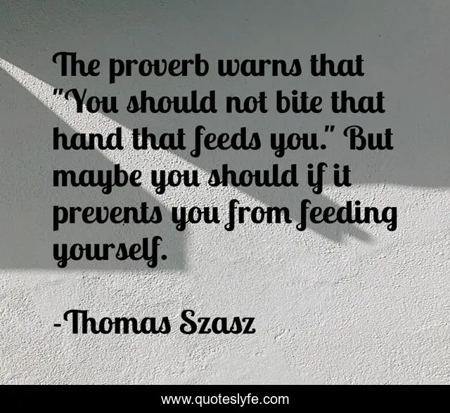 This page presents the quote "The proverb warns that "You should not bite that hand that feeds you." But maybe you should if it prevents you from feeding yourself.". Author of this quote is Thomas Szasz. This quote is about self, reliance,.