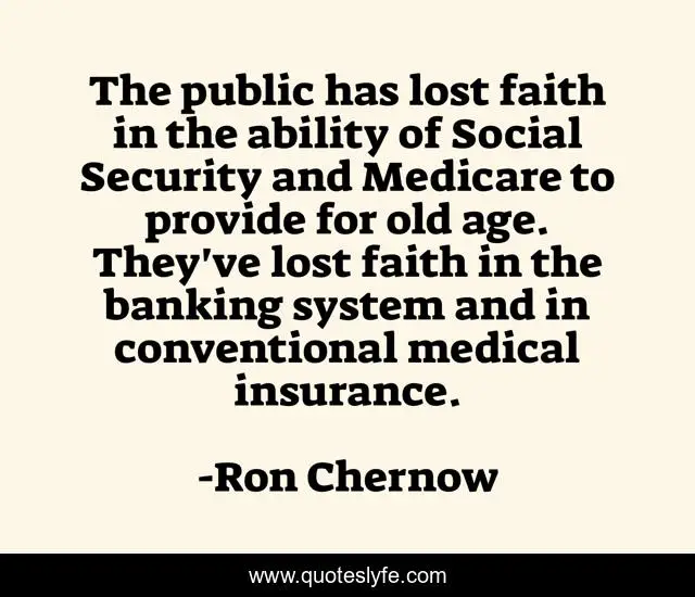 This page presents the quote "The public has lost faith in the ability of Social Security and Medicare to provide for old age. They've lost faith in the banking system and in conventional medical insurance.". Author of this quote is Ron Chernow. This quote is about faith, age, old age,.