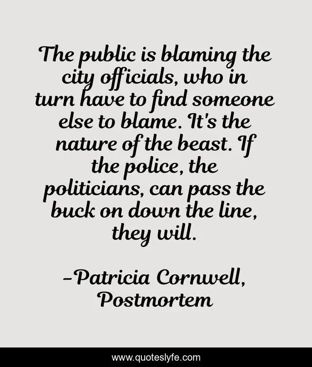 This page presents the quote "The public is blaming the city officials, who in turn have to find someone else to blame. It's the nature of the beast. If the police, the politicians, can pass the buck on down the line, they will.". Author of this quote is Patricia Cornwell, Postmortem. .