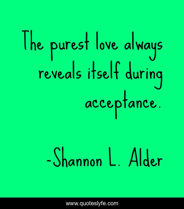 This page presents the quote "The purest love always reveals itself during acceptance.". Author of this quote is Shannon L. Alder. This quote is about faith, love, acceptance, purity, true, affection,.