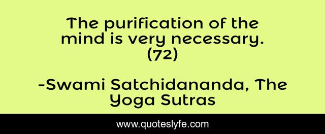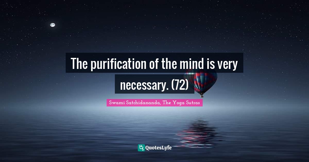 This page presents the quote "The purification of the mind is very necessary. (72)". Author of this quote is Swami Satchidananda, The Yoga Sutras. This quote is about mind, purity, purification,.