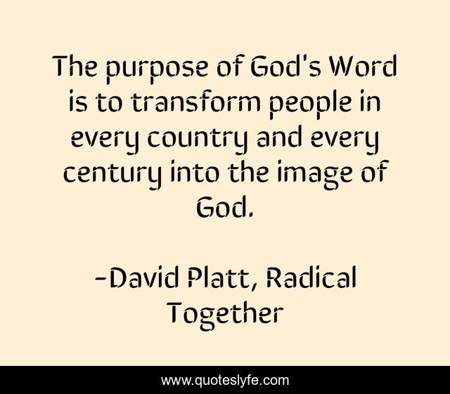 This page presents the quote "The purpose of God's Word is to transform people in every country and every century into the image of God.". Author of this quote is David Platt, Radical Together. This quote is about christian, christian-living, christianity,.