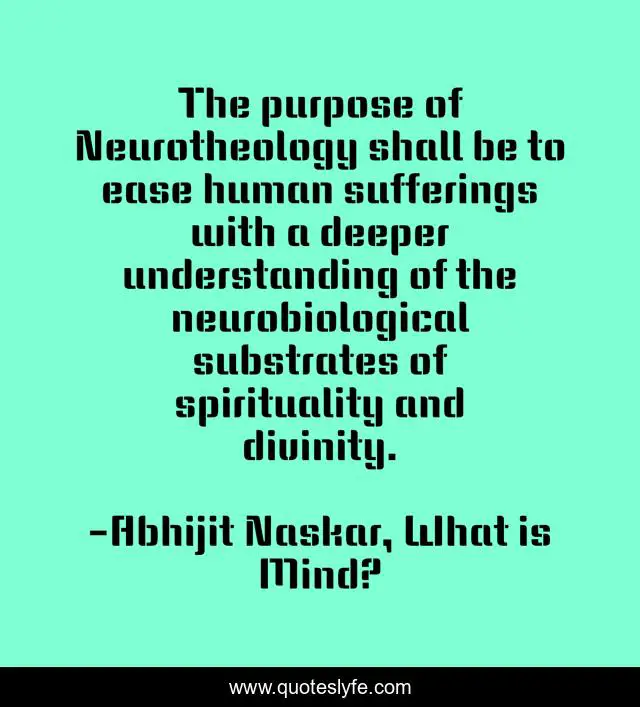 This page presents the quote "The purpose of Neurotheology shall be to ease human sufferings with a deeper understanding of the neurobiological substrates of spirituality and divinity.". Author of this quote is Abhijit Naskar, What is Mind?. This quote is about biology, neuropsychology, spirituality, science, science-and-religion, religion, neuroscience, philosophy-of-science, neurotheology,.