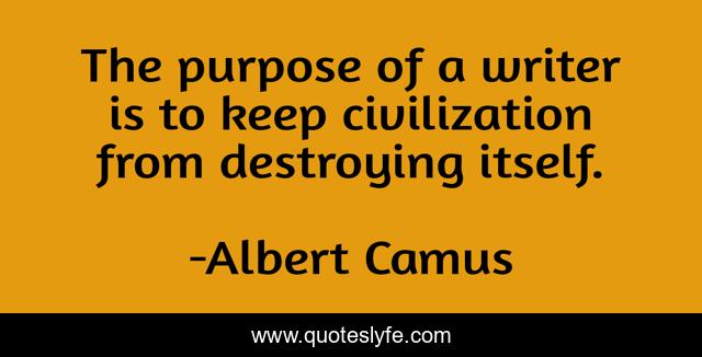 This page presents the quote "The purpose of a writer is to keep civilization from destroying itself.". Author of this quote is Albert Camus. This quote is about civilization, writers, writing,.