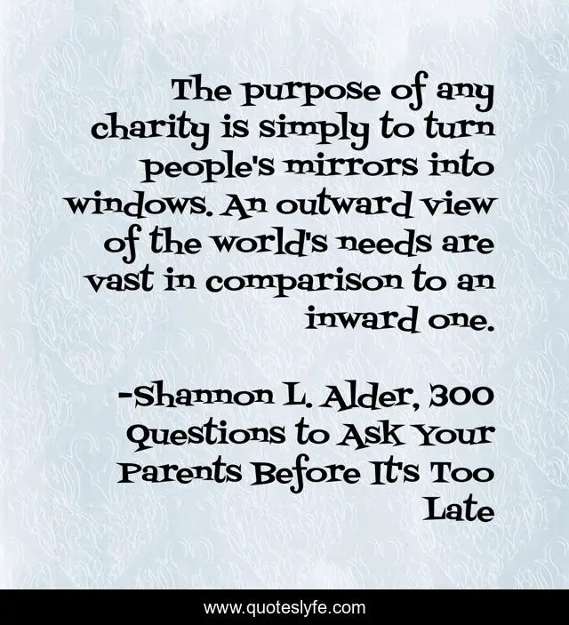 "Shannon L. Alder, 300 Questions to Ask Your Parents Before It's Too Late Quotes." Quoteslyfe.com, 2025. Sat. 06 Dec. 2025. <https://www.quoteslyfe.com/quote/The-purpose-of-any-charity-is-simply-250403>.