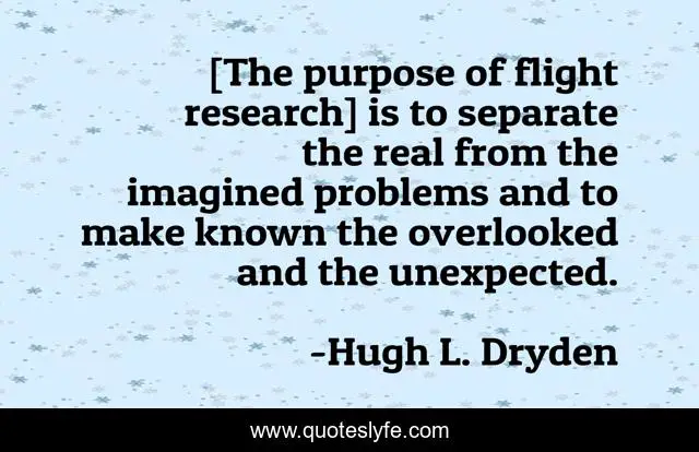This page presents the quote "[The purpose of flight research] is to separate the real from the imagined problems and to make known the overlooked and the unexpected.". Author of this quote is Hugh L. Dryden. This quote is about real, flight-research, problems, expectations, research,.