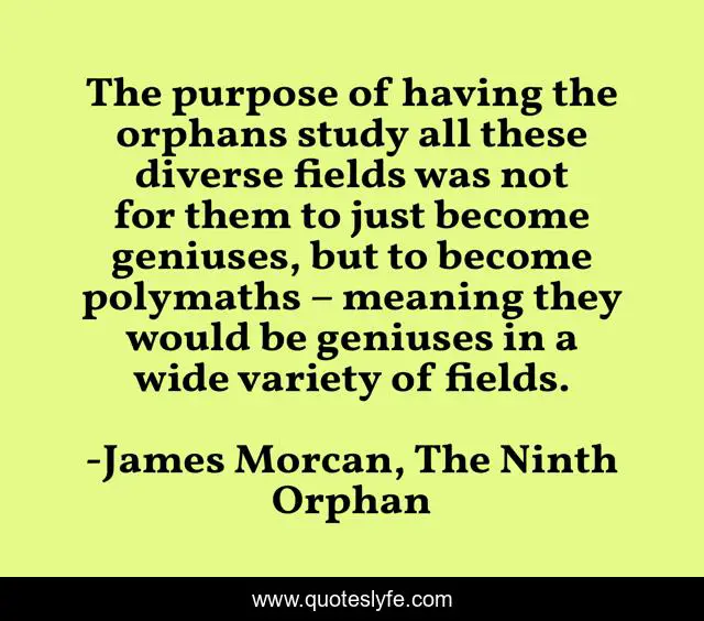 This page presents the quote "The purpose of having the orphans study all these diverse fields was not for them to just become geniuses, but to become polymaths – meaning they would be geniuses in a wide variety of fields.". Author of this quote is James Morcan, The Ninth Orphan. This quote is about orphanage, author, higher-intelligence, intelligence, orphans, genius, genius-writers, polymath, geniuses,.