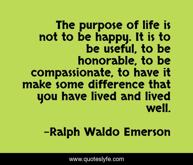 This page presents the quote "The purpose of life is not to be happy. It is to be useful, to be honorable, to be compassionate, to have it make some difference that you have lived and lived well.". Author of this quote is Ralph Waldo Emerson. This quote is about helping-others, purpose-of-life, purpose, make-a-difference,.