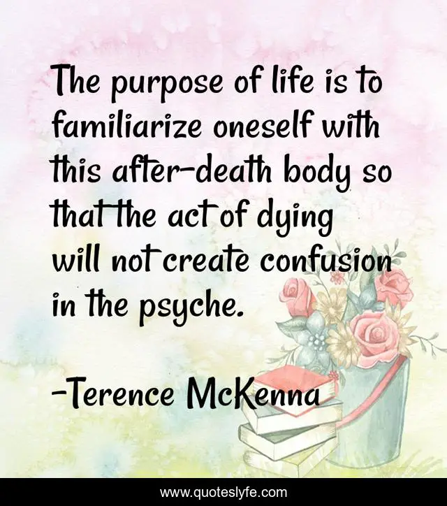 This page presents the quote "The purpose of life is to familiarize oneself with this after-death body so that the act of dying will not create confusion in the psyche.". Author of this quote is Terence McKenna. This quote is about life, after-death, dying,.