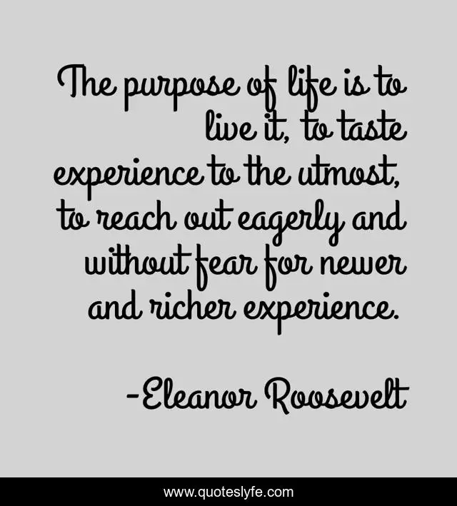 This page presents the quote "The purpose of life is to live it, to taste experience to the utmost, to reach out eagerly and without fear for newer and richer experience.". Author of this quote is Eleanor Roosevelt. This quote is about life, enjoy-life, experience, adventure, inspirational, carpe-diem, enthusiasm, purpose-of-life, live-in-the-moment,.